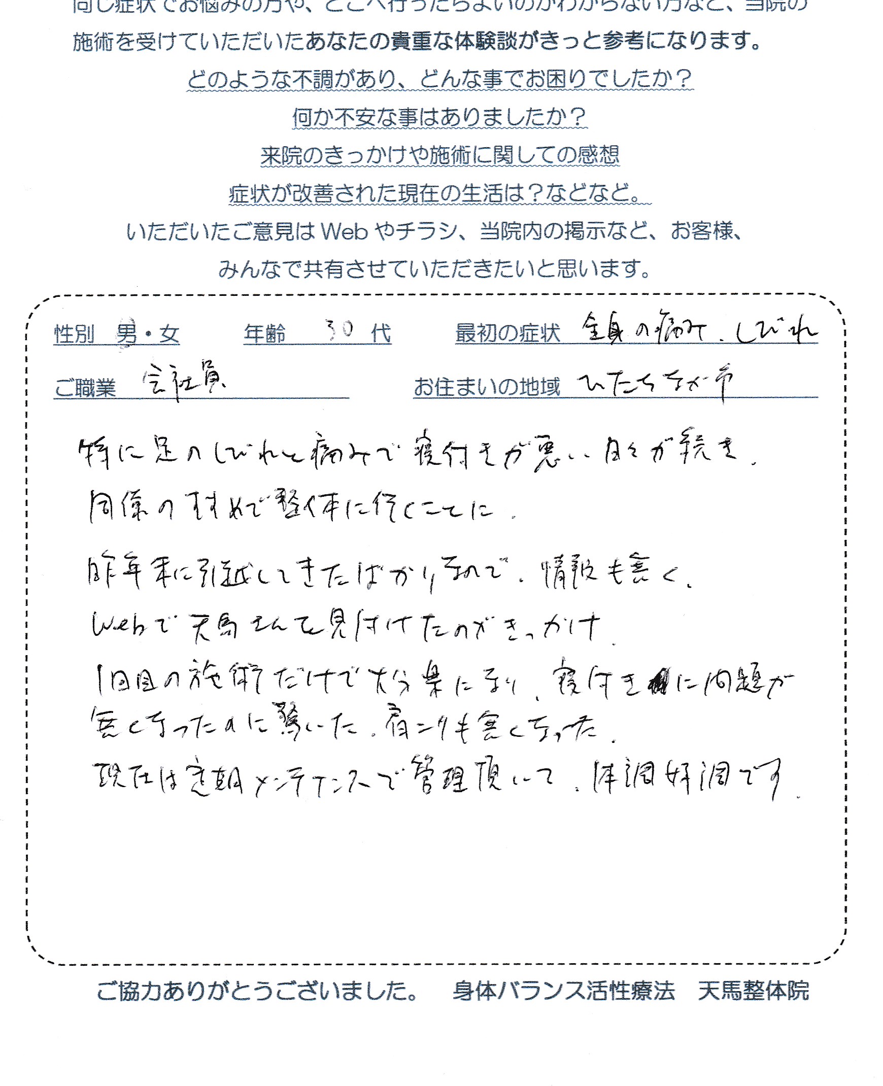 同僚にすすめられて整体に行くことを考えましたが、昨年末に引っ越してきたばかりで情報がなく、 WEBで天馬整体院を見つけたのが来院のきっかけです。